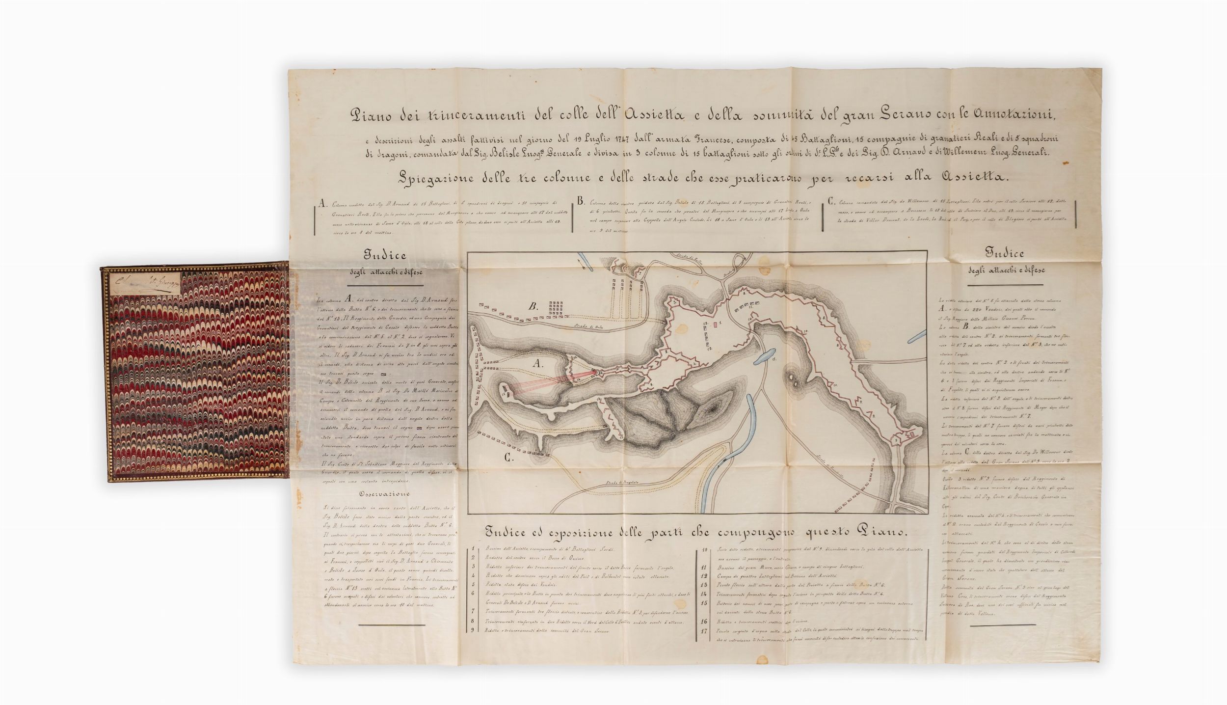 1747 Grande foglio di carta lucida da disegno tecnico, 600 x 830 mm. ripiegata, recante al centro il piano militare disegnato dei trinceramenti e delle difese organizzate, contornato dal testo di commento che esplicita le disposizioni delle truppe, le difese, gli attacchi e la sequenza. Il tutto conservato in un'elegante legatura in pelle bordeaux con decorazioni in oro ai piatti e titolo.