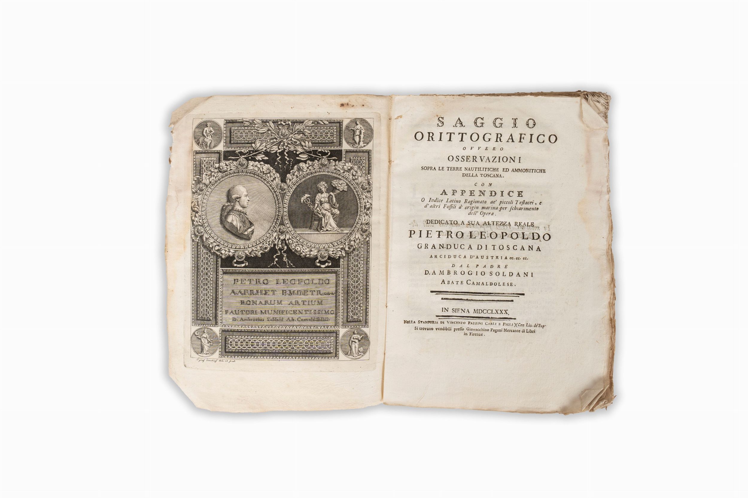 1780 Siena, Pazzini Carli e figli, 1780. In 4°. Con XXV tavole incise da Ciro Santi, ritratto del Granduca Leopoldo di Toscana entro medaglione in antiporta, lieve gora d'acqua marginale, tav. VI staccata, legatura in cartoncino azzurro e carta decorata, tassello con titolo manoscritto al dorso, sciupata. Firma di appartenenza alla carta di guardia