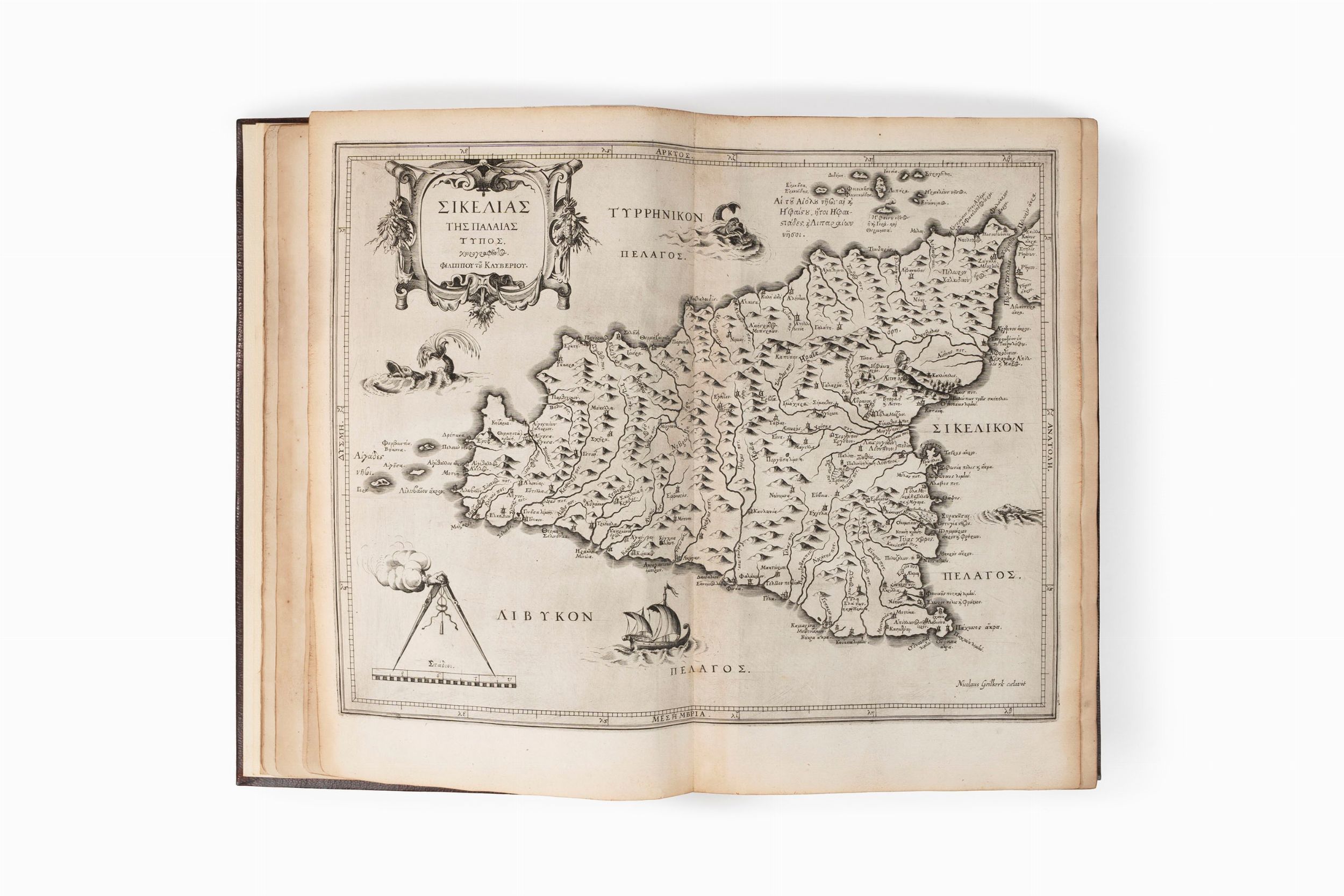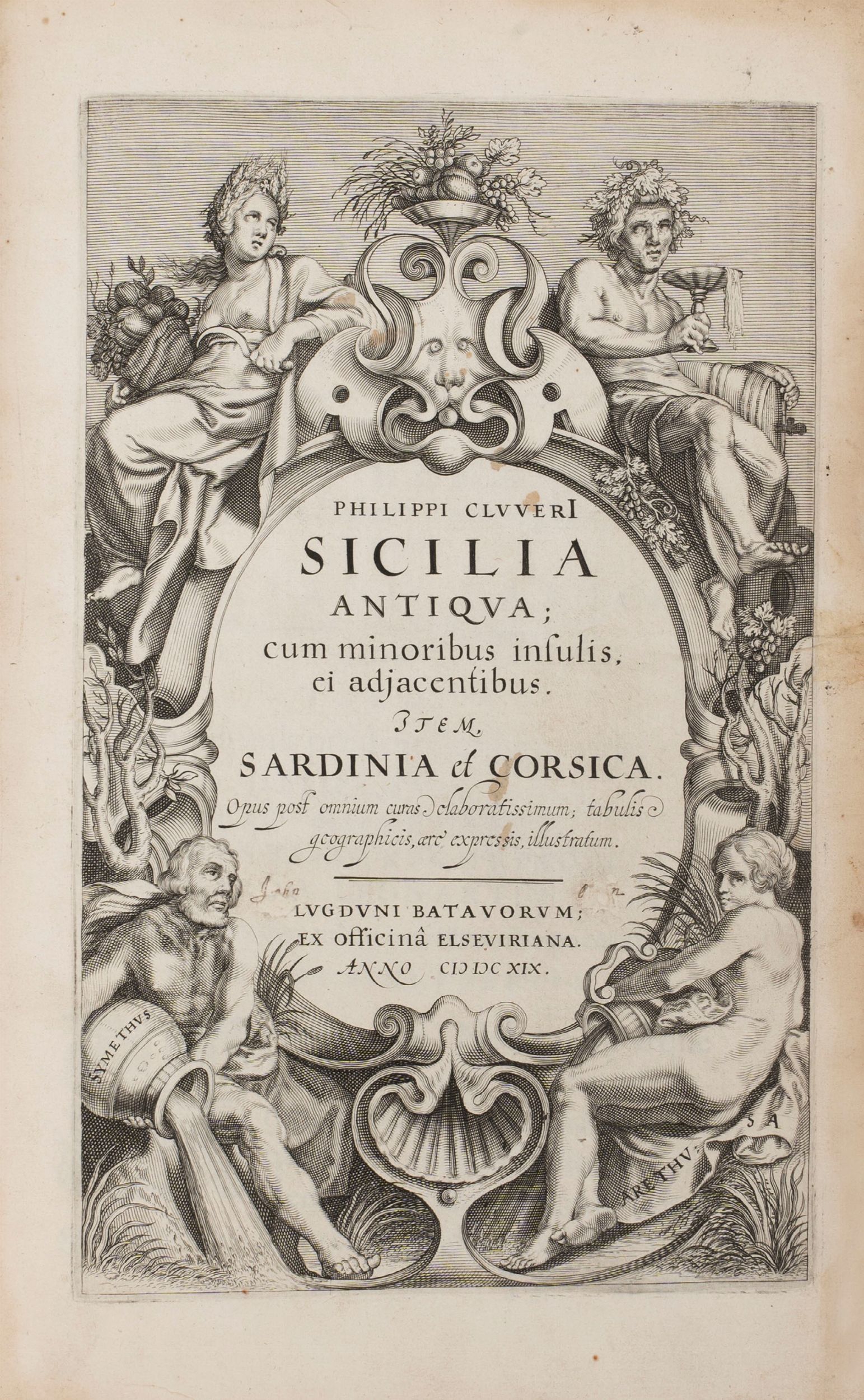 Folio, artistico frontespizio inciso su rame con titolo racchiuso in cornice con figure allegoriche e mitologiche ai lati, pp. 16 nn. compreso il frontespizio- 510-12 nn con 5 carte geografiche incise su rame su doppio foglio: Sicilia antica con toponimi latini - Sicilia antica con toponimi greci - Siracusa antica - Isole orientali e Corsica antica e Sardegna antica. Leggera brunitura marginale. Artistica legatura moderna, ad imitazione di legatura seicentesca in piena pelle marrone, dorso a sei scomparti, tassello con titolo in oro, cornici e fregi a secco ai piatti. Rarissima edizione originale.