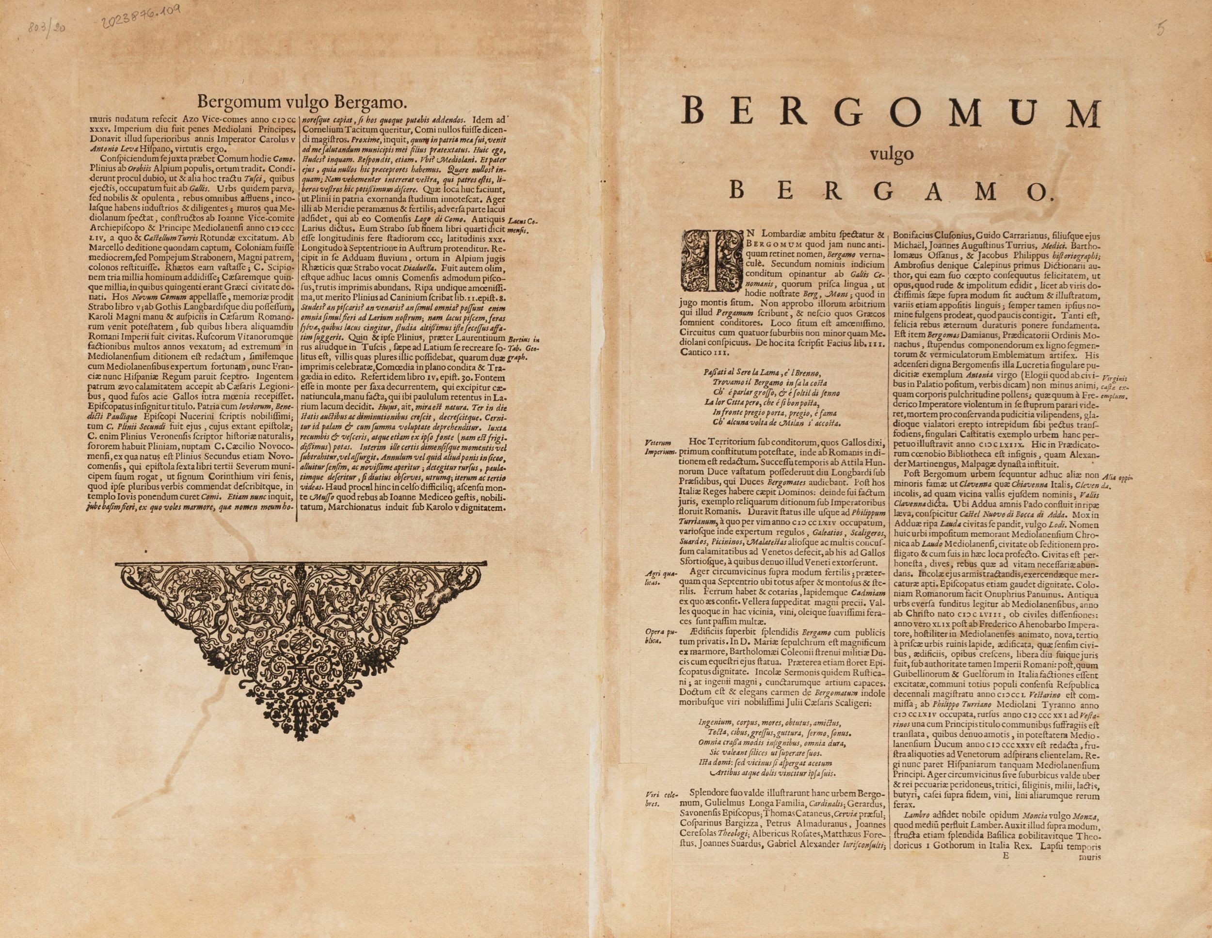 1640 Amstelodami, Henricus Hondius Excudit. Incisione su rame, 1640. Coloritura coeva misura cm. 50 x 37,8 più margine. Titolo e Scala Miliare racchiusi in artistici cartigli. Testo latino al verso. Qualche strappo ai margini, leggera brunitura. Include Bergamo, il Lago di Como e il Lago d’Iseo.