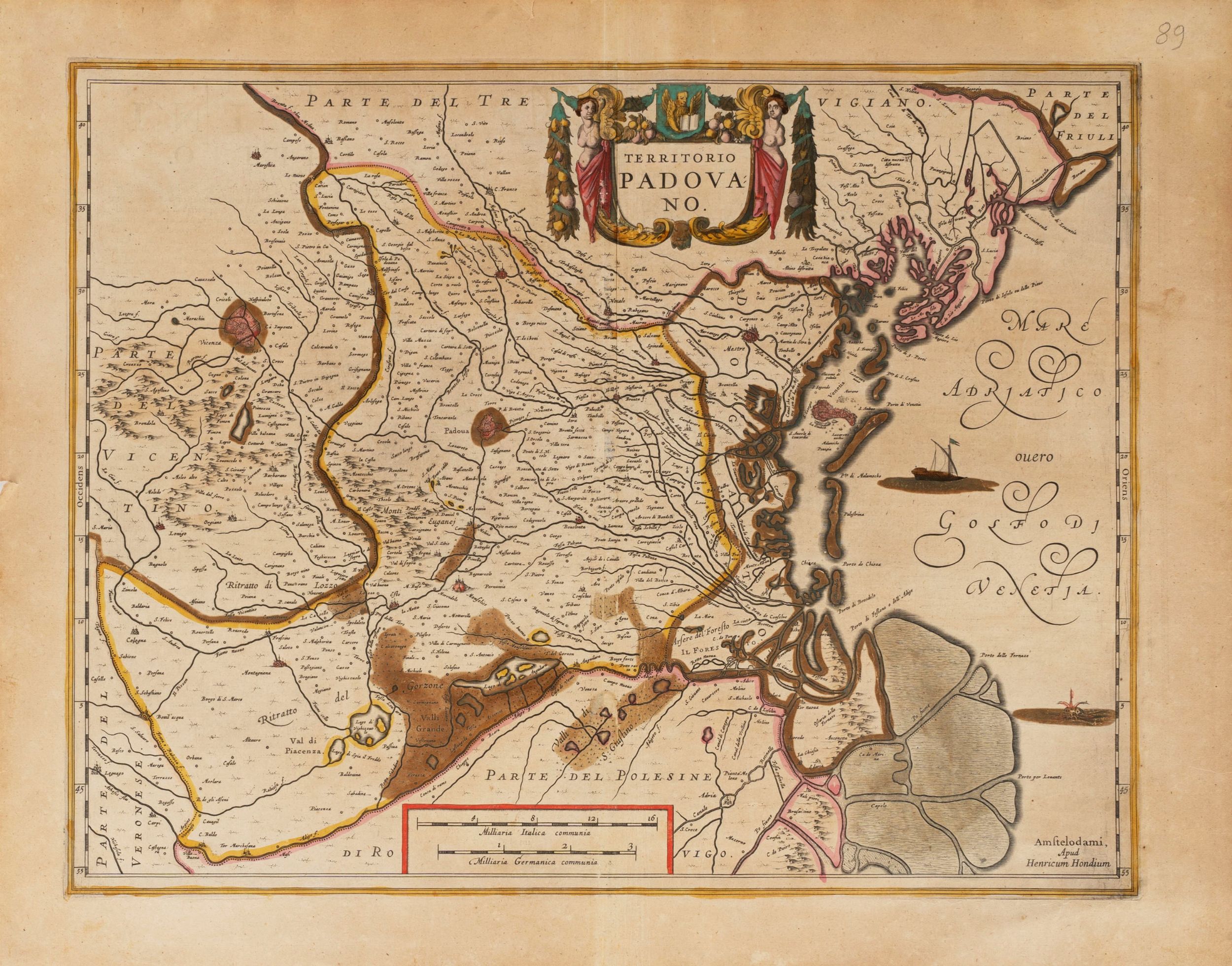 1640 Amstelodami, Sumptibus Henrici Hondii. Incisione su rame, c.ca 1640. Coloritura coeva. Misura cm 38,5 x 49,3 più margine. Titolo e scala miliare racchiusi in artistici cartigli. Testo latino al verso. Primo stato.
