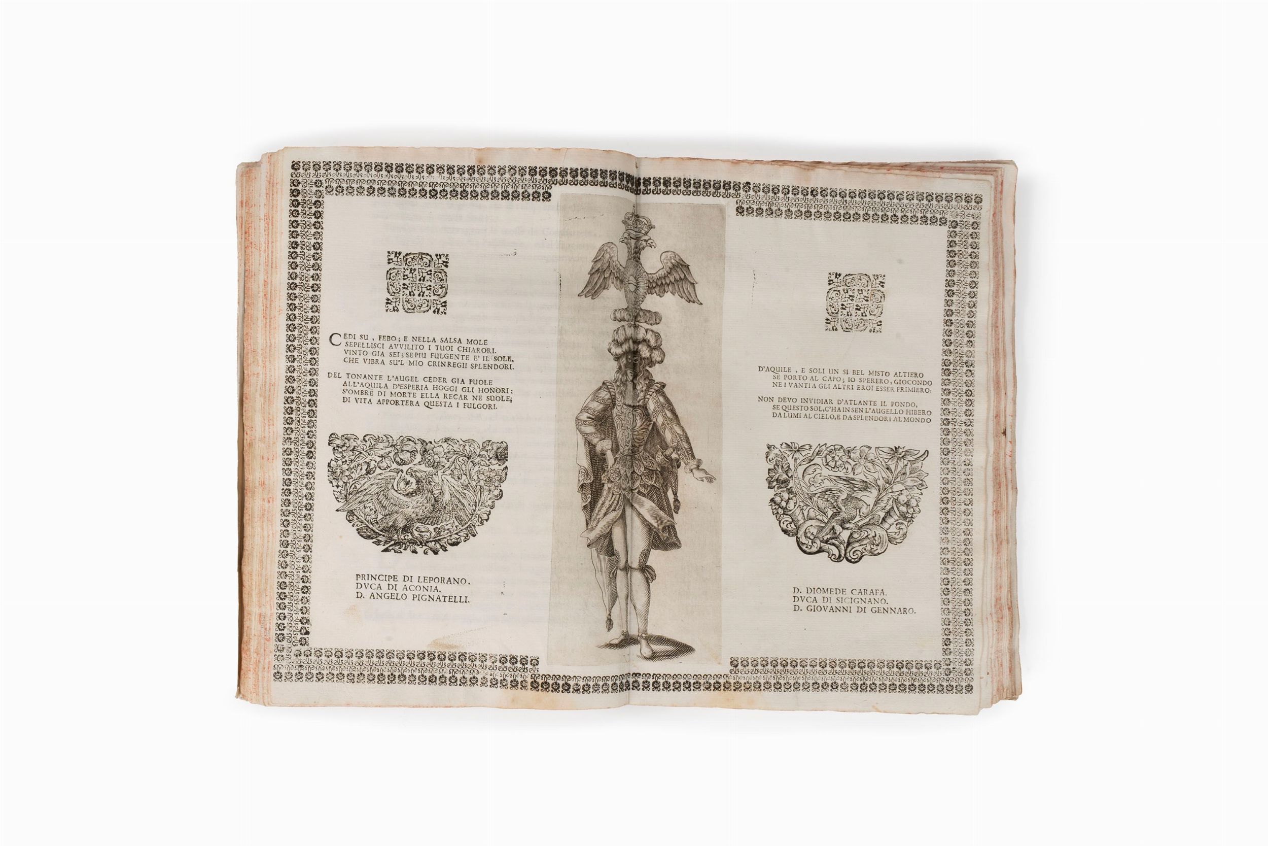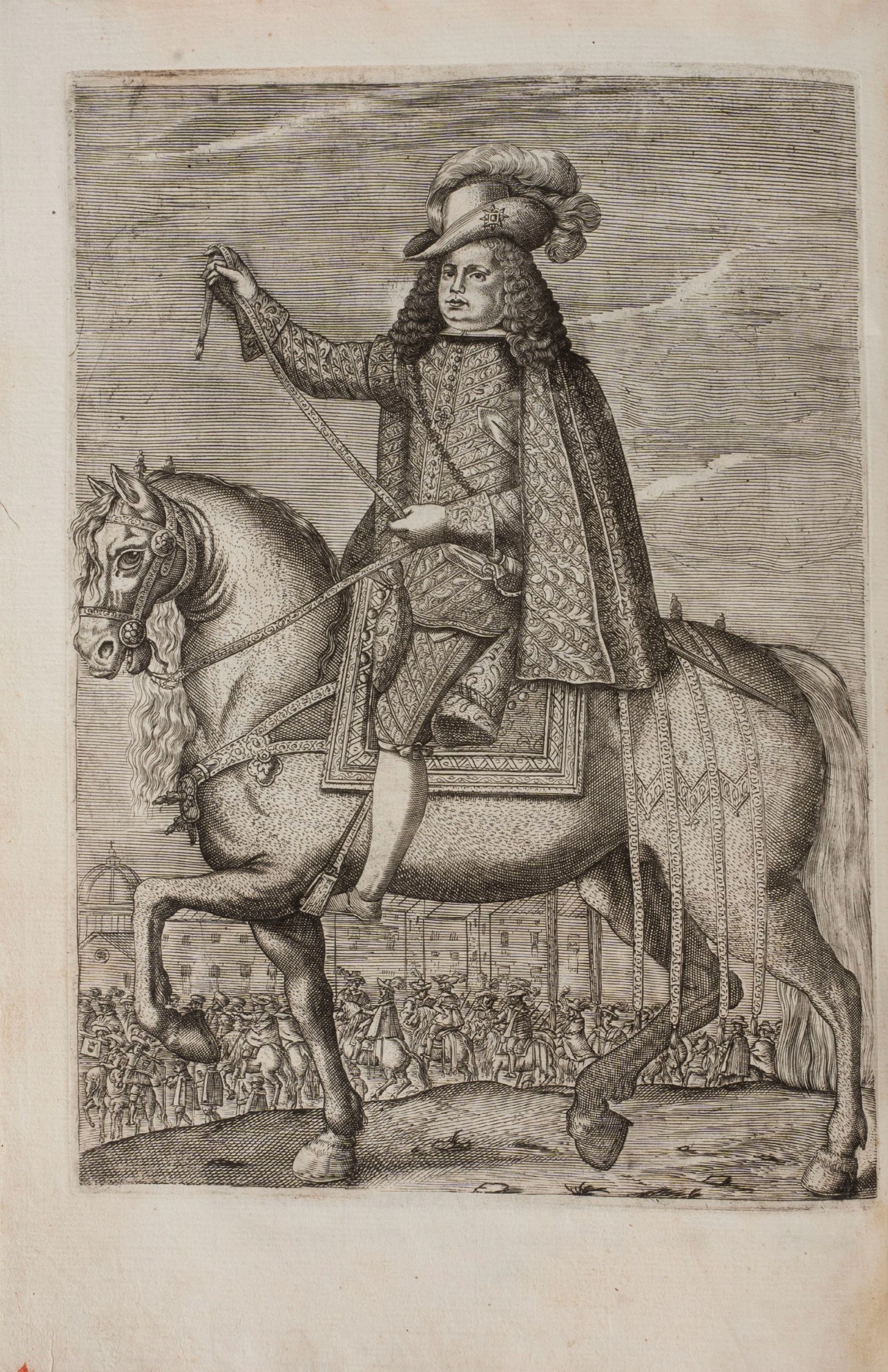 1680 In Napoli, per Salvatore Castaldi Regio Stampatore, 1680. In Folio p., artistica antiporta allegorica, pp. 96, una tavola raffigurante il Vicerè a cavallo, 28 tavole riguardanti le modalità dei festeggiamenti (le seguenti tavole sono ripetute: n° 1 - 2 - 4 - 6 - 8 - 10 - 12 - 18) e due tavole dalle caratteristiche straordinarie: la prima è una rappresentazione prospettica di Napoli con la cavalcata del corteo reale e la minuziosa descrizione di tutti i suoi partecipanti con lo sfondo della città dal Sebeto a Posillipo; la seconda incisione descrive l'anfiteatro creato davanti a Palazzo Reale per il carosello dei cavalieri e degli altri giochi nunziali. Ambedue le tavole sono da mettere in relazione con la cavalcata per la visita di Maria d'Austria eseguita nel 1632 da Alessandro Baratta; la seconda tavola è un rifacimento del rame Teatro per il torneo con i carri allegorici... incisa da Nicola Perrey per il volume di A. Cirino per la nascita del Principe di Spagna nel 1658, (Cfr. E.BELLUCCI Capolavori in festa, 2000 pp.249) nelle altre tavole minori sono riprodotti i cartelli delle varie quadriglie del carosello ornati da allegorie e stemmi. (Cfr. CECI, 1937 n° 146). Alcuni restauri. Antiporta e frontespizio allentati, qualche piccolo foro al frontespizio. Legatura coeva in piena pergamena, titolo calligrafico, tagli colorati. Questo esemplare fu esposto alla mostra “Civiltà del seicento” tenuta a Napoli dal 24 ottobre 1984 al 14 aprile 1985.