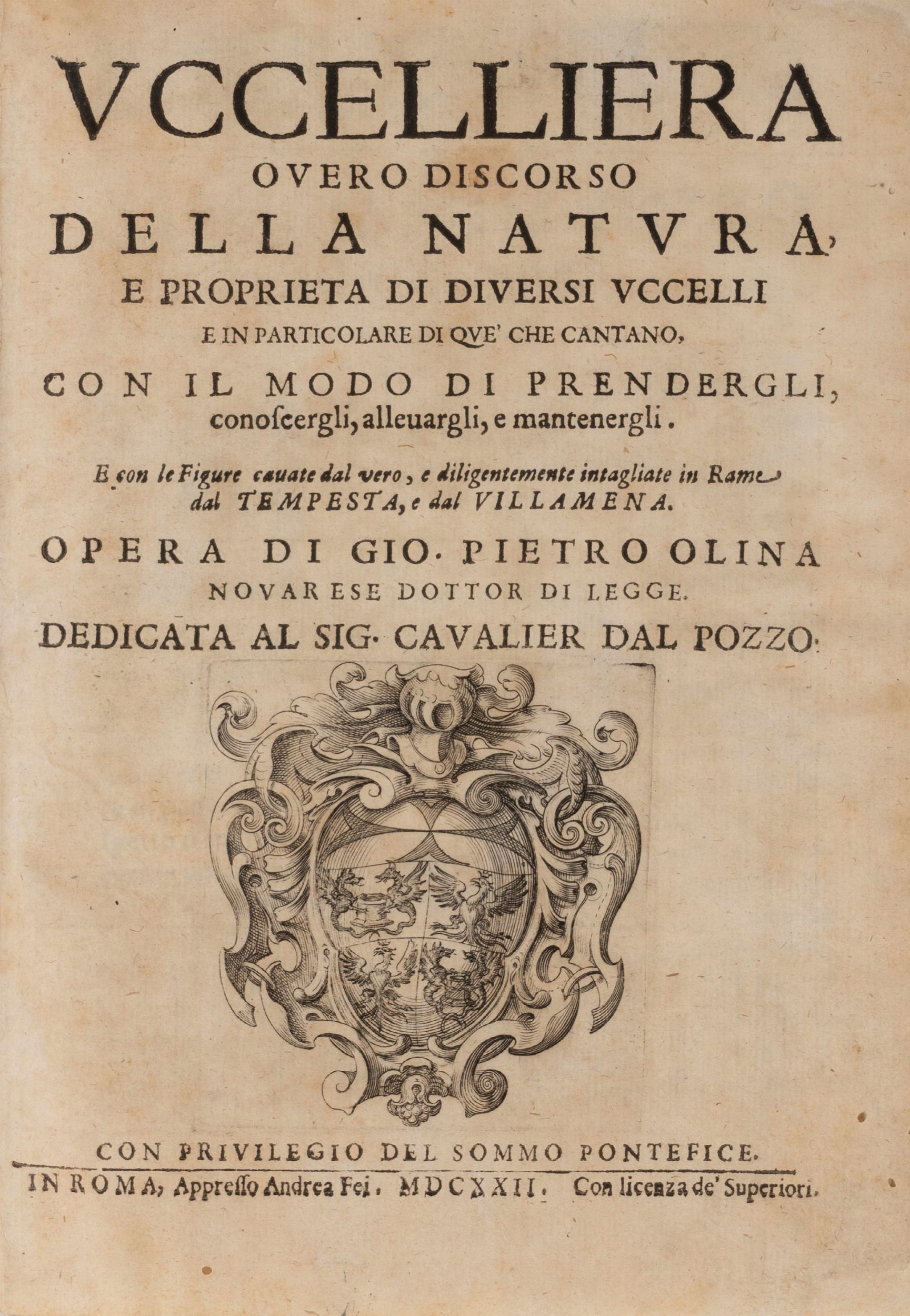 1622 In Roma, Appresso Andrea Fei, 1622. 4°, stemma del cavalier Cassiano Dal Pozzo, cui l'opera è dedicata, incisa su rame al frontespizio, 6 cc. nn.; 67 cc. num.; poi la numerazione segue per pagina da 68 a 81; 6 cc. nn., abili restauri in diverse carte, brunitura piccoli fori di tarli. Legatura settecentesca in piena pergamena, titolo e fregi in oro al dorso, tagli colorati. Edizione originale.