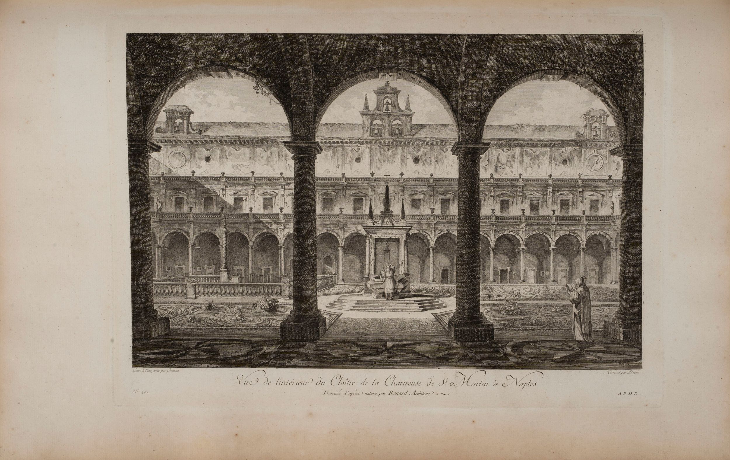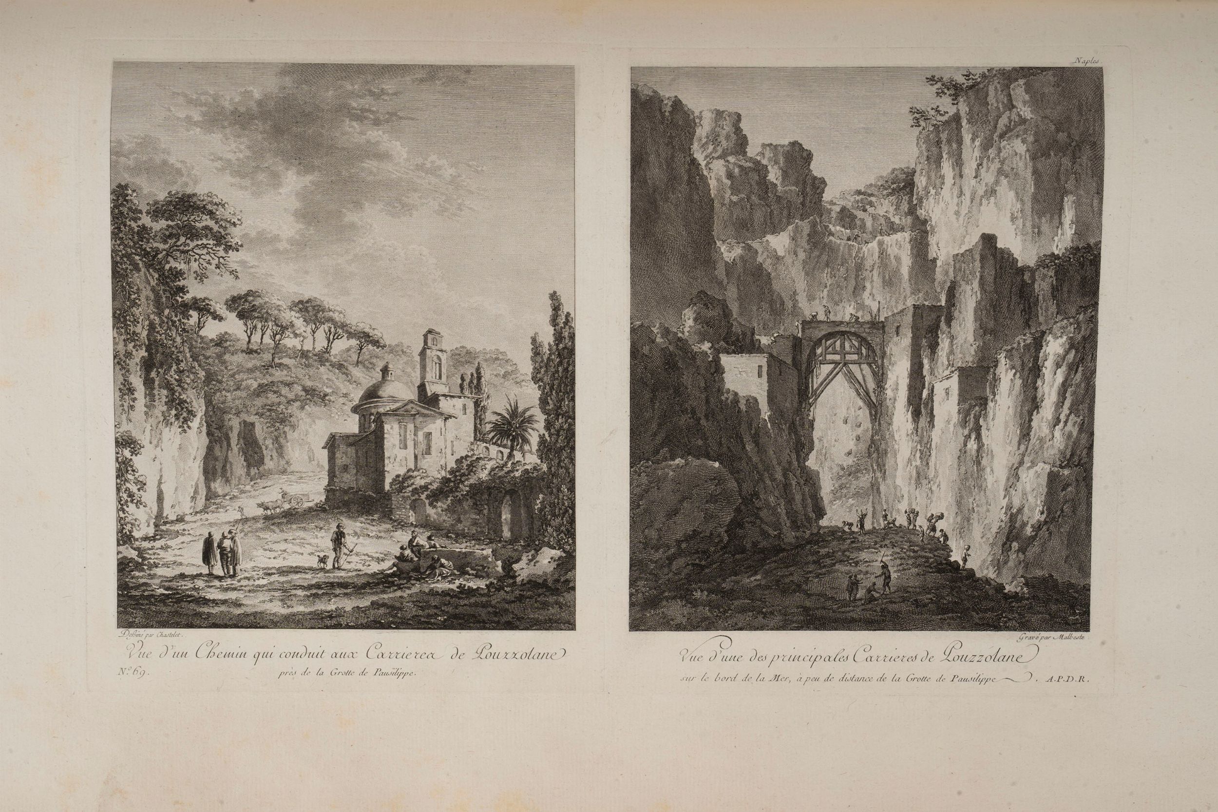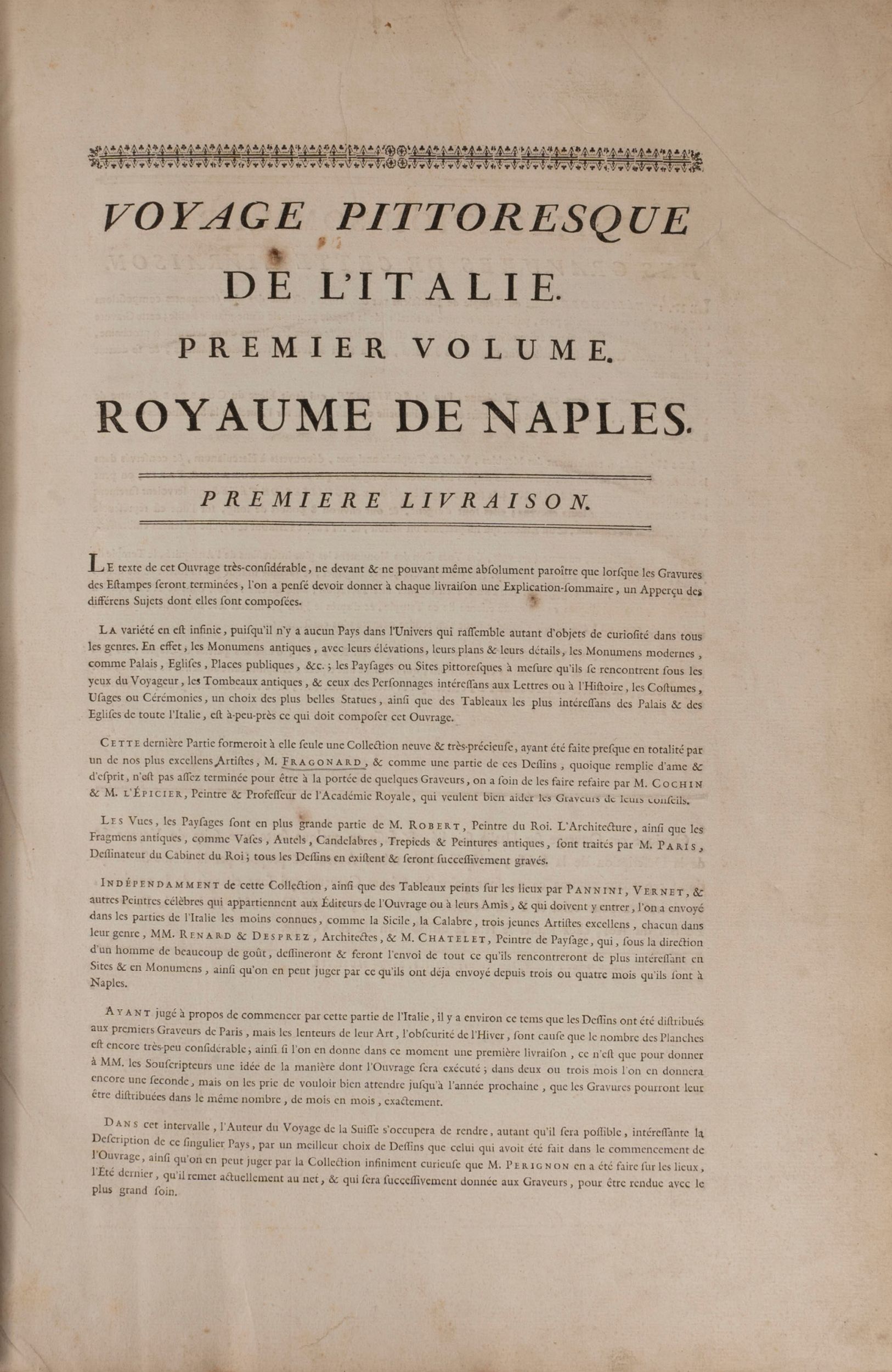 1778 Parigi, La Fosse, 1778 - 1780. Folio, 16 fascicoli per complessive pagine 112 e 125 tavole incise all'acquaforte raffiguranti vedute e monumenti della città di Napoli, del Vesuvio, di Pompei ed Ercolano. Legatura coeva in piena pelle bazzana, dorsi e sei scomparti con alcuni difetti, titolo e fregi in oro al dorso.