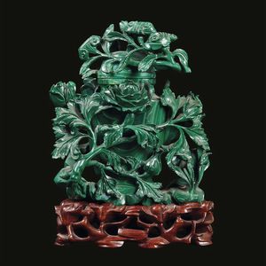VASO CON COPERCHIO, CINA, DINASTIA QING, SEC.XX in malachite verde spinacio, intagliato con fiori e rami. Alt.cm [..]