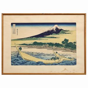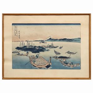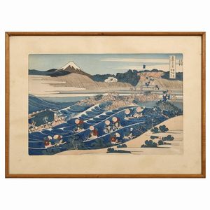 XILOGRAFIA, GIAPPONE, PERIODO MEIJI, SEC.XIX su carta raffigurante paesaggio con città mercantile su un'isola. [..]