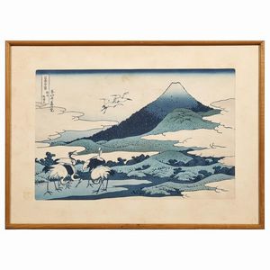 XILOGRAFIA, GIAPPONE, PERIODO MEIJI, SEC.XIX su carta raffigurante un paesaggio con un gruppo di Gru stanti e [..]