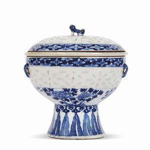 ZUPPIERA, CINA, DINASTIA QING, SEC. XIX in porcellana bianco blu, splendidamente decorata con motivi di nuvole, [..]