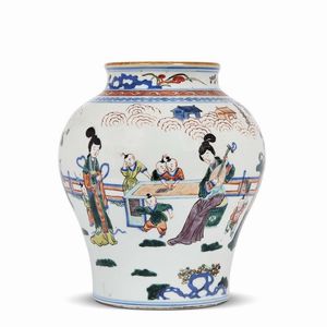 VASO, CINA, DINASTIA QING, SEC. XVII in porcellana bianco blu Wucai raffigurante quattro concubine imperiali e [..]
