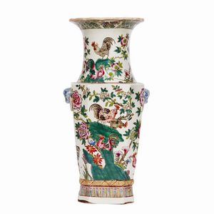 VASO, CINA, SEC. XX in porcellana policroma decorato con galli su roccia e rami fioriti. Alt. cm 42,5 中国 [..]