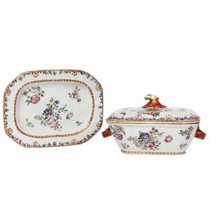 ZUPPIERA, CINA, DINASTIA QING, SEC.XVIII completa di vassoio e coperchio, realizzata in porcellana policroma, [..]
