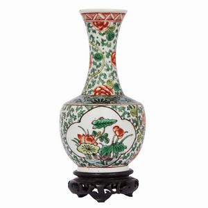 VASO, CINA, SEC. XX-XXI in porcellana della famiglia verde è abbellito da decori floreali e loto. Alt. [..]