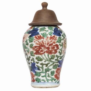 VASO CON COPERCHIO, CINA, SEC. XVII in porcellana Wucai con collo tagliato, improntato con delicati decorazioni [..]