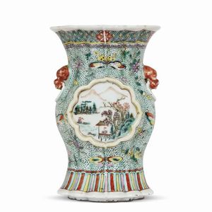 VASETTO, CINA, DINASTIA QING, SEC. XX in porcellana policroma a forma HaiTang decorato con paesaggio entro le [..]