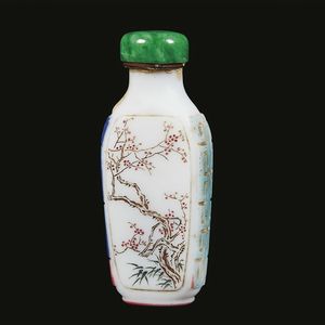 GRUPPO DI QUATTRO SNUFF BOTTLES, CINA, DINASTIA QING, SEC.XIX-XX una in vetro e porcellana, due in vetro e una [..]