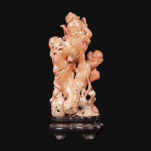 INTAGLIO, CINA, DINASTIA QING, SEC.XX in corallo salmone, raffigurante stella Shou. Alt.cm 12 Gr. 183 清 [..]