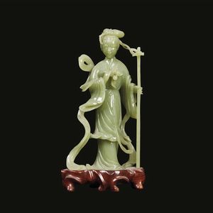 INTAGLIO, CINA, DINASTIA QING, SEC.XIX-XX in giada verde raffigurante una figura femminile che tiene in mano una [..]