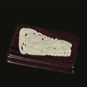 INTAGLIO, CINA, DINASTIA QING, SEC. XIX in giada verde pallido raffigurante una fenice, incastonato su una base [..]