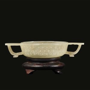 TAZZINA, CINA, DINASTIA QING, SEC. XVIII in giada bianca verde intagliata con motivi Ruding 乳钉纹, [..]