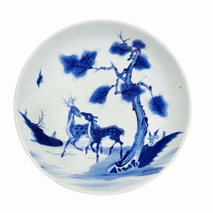 PIATTO,CINA, DINASTIA QING, SEC. XIX in porcellana bianco blu che ritrae due cervi fra gli alberi. Diam. cm 28,6 [..]