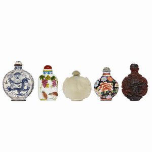 GRUPPO DI CINQUE SNUFF BOTTLE, CINA, SEC. XX una in porcellana raffigurante al centro un dragone, una in porcellana [..]
