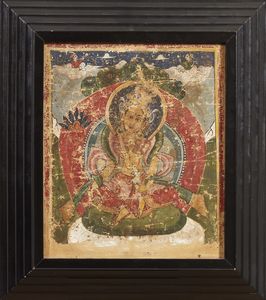 THANGKA, NEPAL, SEC. XV-XVI raffigurante Buddha seduto con gambe incrociate Dim. cm 26,2x31,5 senza cornice [..]
