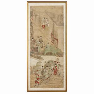 DIPINTO, CINA, SEC. XIX-XX su carta raffigurante un corteo trionfale e concerto musicale all'aperto. Dim. cm 119,5x29 [..]