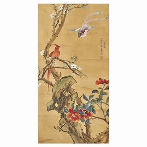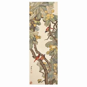 DIPINTO, CINA, SEC. XX su carta rappresentante uccelli su rami di piante con foglie e bacche. Dim. cm 107,7x36,8 [..]