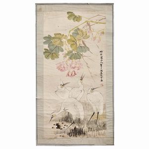 DIPINTO, CINA, SEC. XX su carta raffigurante uno stormo di Egretta garzette e un albero con fiori sbocciati Dim. [..]