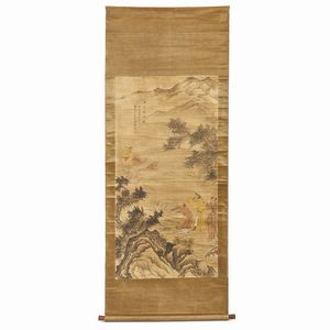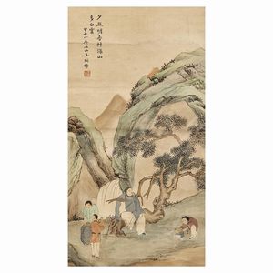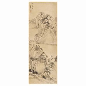 DIPINTO, CINA, SEC. XX su carta che ritrae personaggi in un contesto montano. Firma Wang Sanshan Dim. cm 58,7x31,3 [..]
