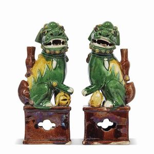 COPPIA DI CANI DI PHO, CINA, DINASTIA QING, SEC. XVIII-XIX poggiano su basi quadrate in porcellana biscuit Sancai [..]