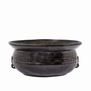 CONTENITORE, CINA, SEC. X-XVI in bronzo con due elementi decorativi a forma di testa di elefante, sul fondo internamente [..]