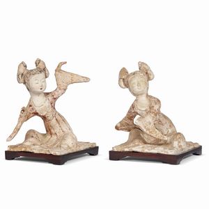 COPIA DI SCULTURE, CINA, DINASTIA TANG, SEC. VIII in gres raffigurante ballerine sedute. Alt.cm 19,5 - 20 唐 [..]