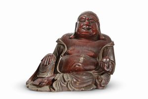 BUDAI, CINA, TARDA DINASTIA QING, SEC. XX in legno laccato e dipinto, veste che scivola lungo il corpo finemente [..]