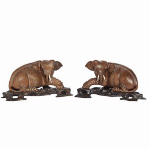 COPPIA DI ELEFANTI, CINA, TARDA DINASTIA QING, SEC. XX in legno duro rappresentanti due elefanti sdraiati. Alt. [..]