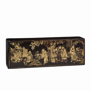 CONTENITORE, CINA, DINASTIA QING, SEC. XIX-XX in legno laccato con dipinto in oro raffigurante personaggi all'aperto. [..]