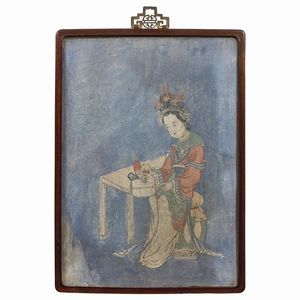 AFFRESCO, CINA, DINASTIA QING, SEC. XIX rappresentante una figura femminile seduta al tavolo. Dim. cm 68x48,5 [..]