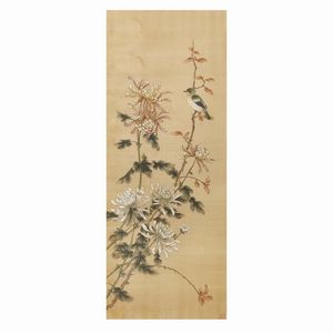 COPPIA DI DIPINTI, CINA, DINASTIA QING, SEC.XX su seta raffigurante fiori Mudan, fiori Ju e volatili. Dim.cm [..]