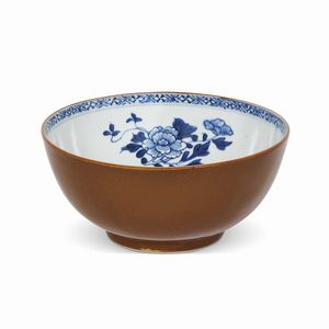 CIOTOLA, CINA, SEC. XIX-XX in porcellana marrone esternamente, internamente decorato in fiori blu. Diam. cm 16 [..]