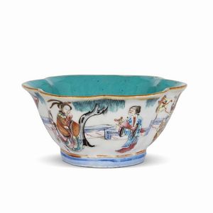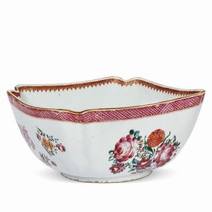 CIOTOLA CON BORDO SQUADRATO, CINA, DINASTIA QING, SEC. XVIII in porcellana policroma è decorata con un [..]