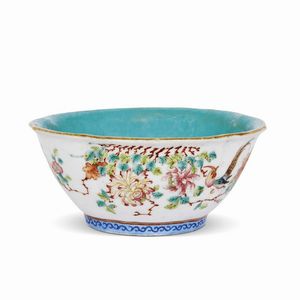 CIOTOLA, CINA, DINASTIA QING, SEC. XIX in porcellana policroma dipinta con rami di fiore, faraona maschio e volatili. [..]