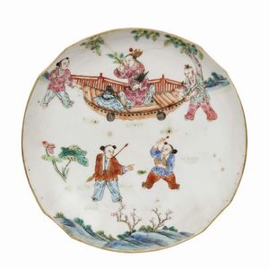 COPPIA DI PIATTI, CINA, SEC. XIX-XX in porcellana policroma raffiguranti scene con bambini che giocano. Diam. [..]
