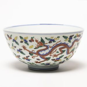 CIOTOLA, CINA, DINASTIA QING, SEC. XVIII in porcellana Wucai decorato con draghi e nuvoli, reca marchio Wanli [..]