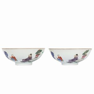 COPPIA DI PIATTI, CINA, SEC. XX in porcellana famiglia verde-rosa rappresentanti due scene con matri sedute ad [..]