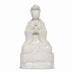 SCULTURA, CINA, DINASTIA QING, SEC.XIX in porcellana bianca Dehua raffigurante Guanyin seduto su base di loto. [..]