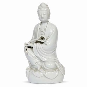 SCULTURA, CINA, DINASTIA QING, SEC.XVIII-XIX in porcellana bianca Dehua raffigurante Guanyin seduto. Alt.cm 27,5 [..]