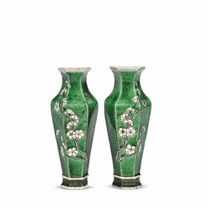 COPPIA DI VASI, CINA, DINASTIA QING, SEC.XVIII da muro in porcellana biscuit verde, entrambi di forma esagonale [..]