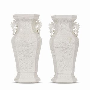 DUE VASI, CINA, DINASTIA QING, SEC.XIX in porcellana bianca di forma poligonale, dotati di due anse ad anello. [..]
