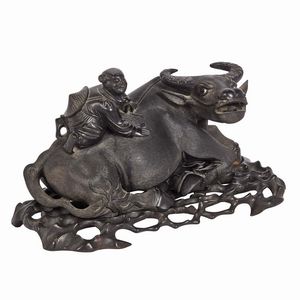 SCULTURA, GIAPPONE, SEC. XX in legno rappresentante un bambino seduto su un bufalo. Alt. cm 20 Lungh. cm 37,5 [..]