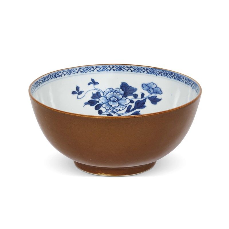 in porcellana marrone esternamente, internamente decorato in fiori blu.
